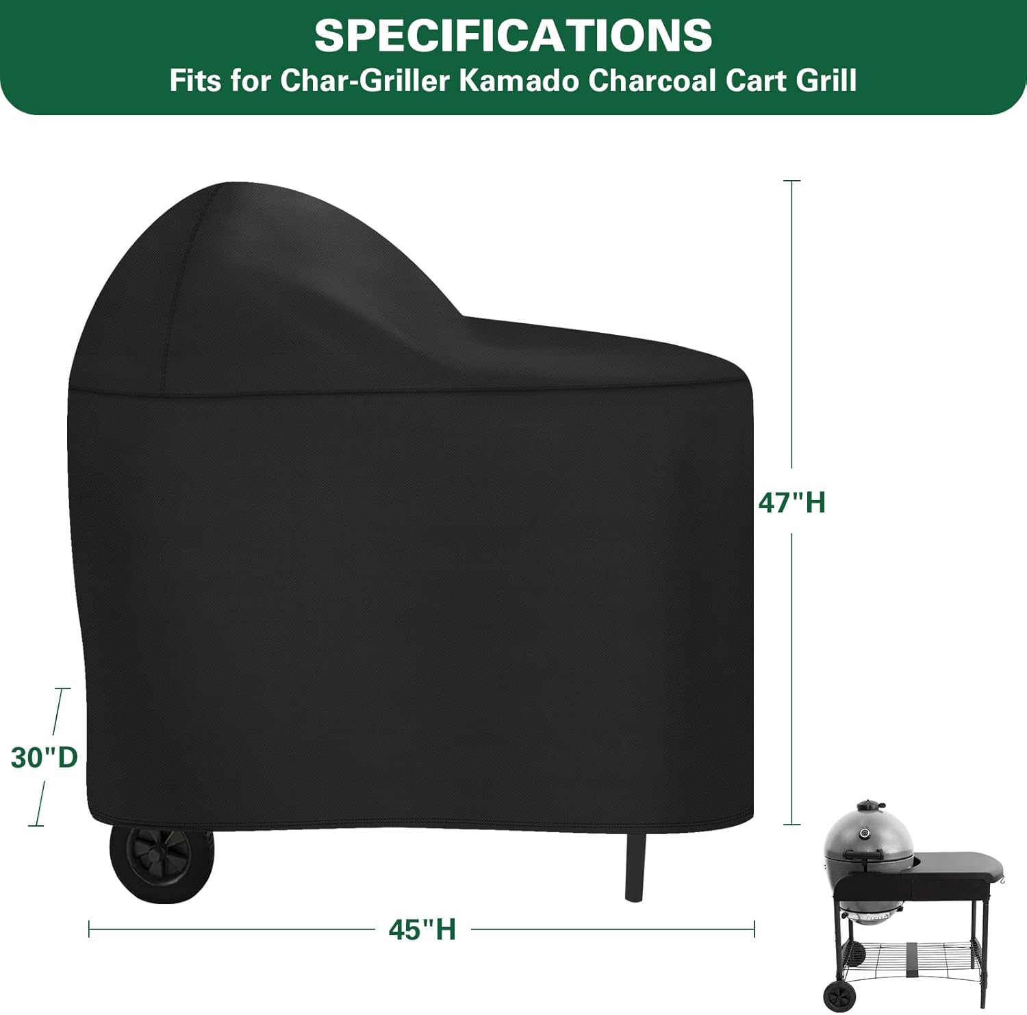 - 【Grill Cover Fit Model】Measures: 30"L x 45"W x 47"H. The bbq grill cover fits for Char-Griller AKORN Kamado Charcoal Cart Grill, model 6520. (Please check the model of your grills carefully before ordering)