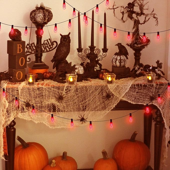 - Halloween Lights :10 feet of outdoor Halloween decorative lights with 10 hanging sockets and flashing flame bloody bulb (1 spare bulb), C9 or E17 middle screw base, 1W C9 Halloween flashing flame bulb. Halloween decorative lights emit warm, bright red light, like a flame, creating a scary Halloween effect and spooky atmosphere.