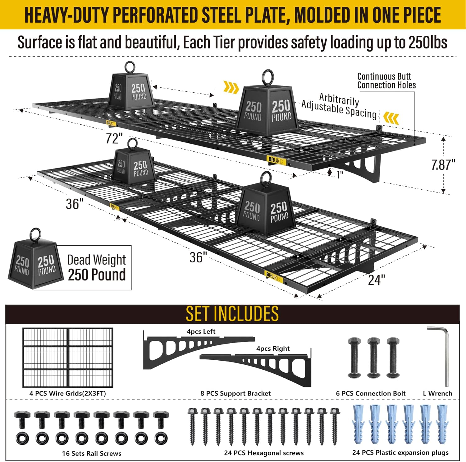 - KIT INCLUDES:Includes 1pc-Grid Shelf; 2pc-Brackets; 6pc-Hexagonal screws (Hardened ∅0.2" L/2"); 4Sets-Rail attachment bolts; 1pc- Drill bit; 1pc-Socket; 1pc-installation manual. All hardware of Brukid Professional Series Wall Mounted Shelf are under strict quality control and testing, We strive to provide our customers with a quality shopping experience, If you have any questions, Please feel free to contact us.