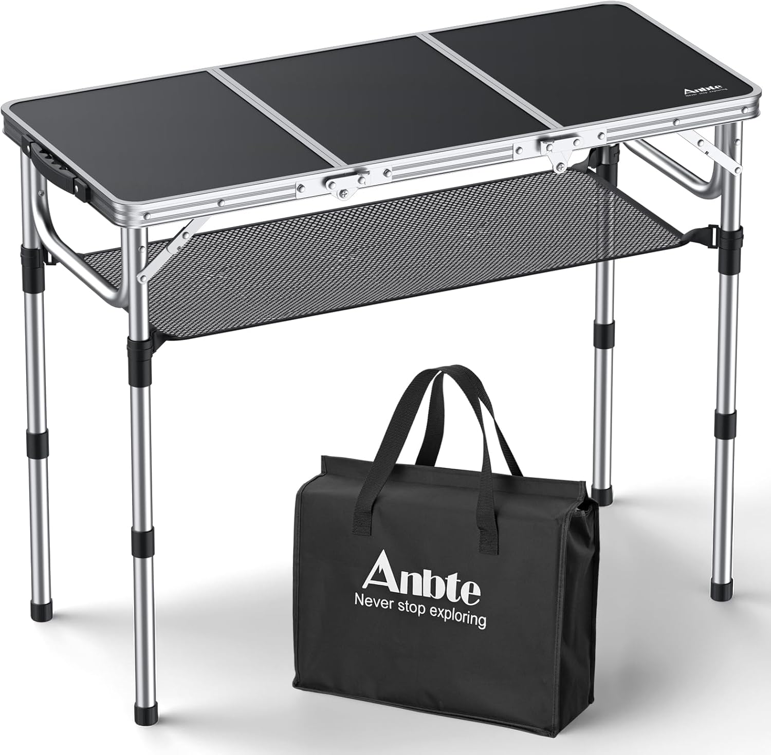 Folding Camping Table with Storage Net, 3ft Camping Table Aluminum Folding Table with 3 Adjustable Height Max 27.1 Inch Picnic Table Portable Table for Outdoor Backyard BBQ, Black