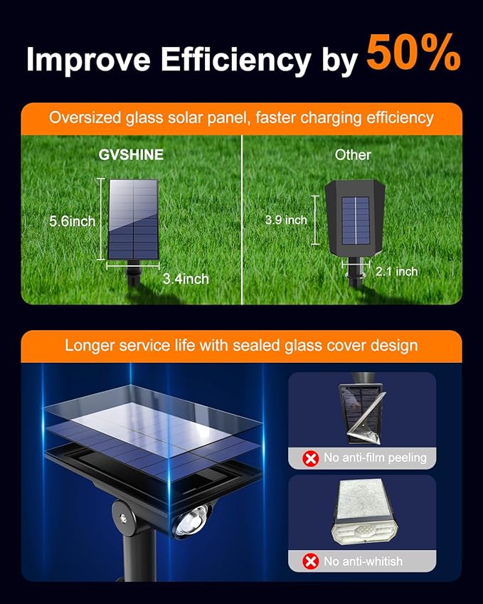 - High Efficiency with Large Glass Solar Panel: GVSHINE's outdoor solar spotlight features an oversized sealed glass cover design (5.6*3.4 inches). Unlike other spotlights with ordinary solar panels, our design prevents rapid aging and whitening of the solar panel from prolonged exposure to sunlight, ensuring proper functionality. Our solar spotlights equipped with a high-capacity 1800mAh battery, it charges for 5-6 hours during the day to provide 6-12 hours of illumination at night.
