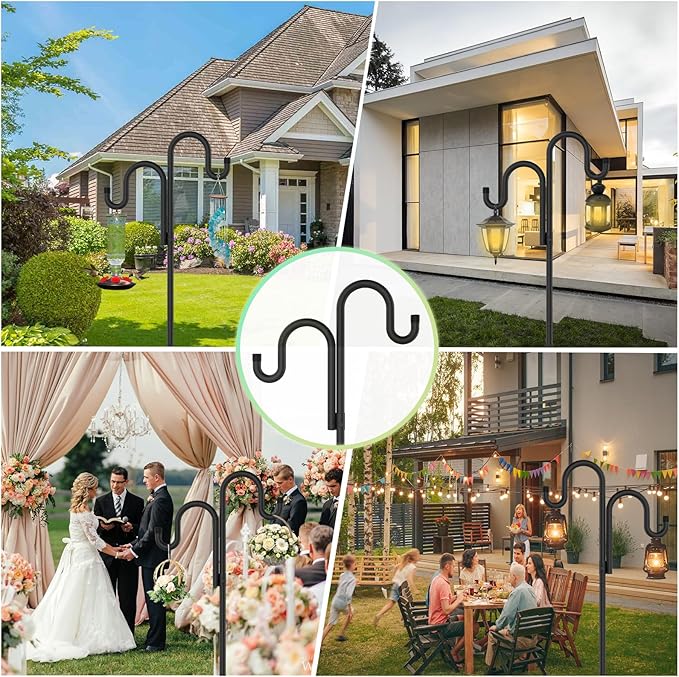 - 【Versatile use】Shepherd hooks are perfect for hanging bird feeders for outside, hummingbird feeders, squirrel proof bird feeders, wreaths, wind chimes, outdoor wedding aisle decorations, lanterns, candle lanterns, solar lights, string lights, street lamps, candlesticks, birdbaths, kissing flower bulbs, flower pots, targets and more.
