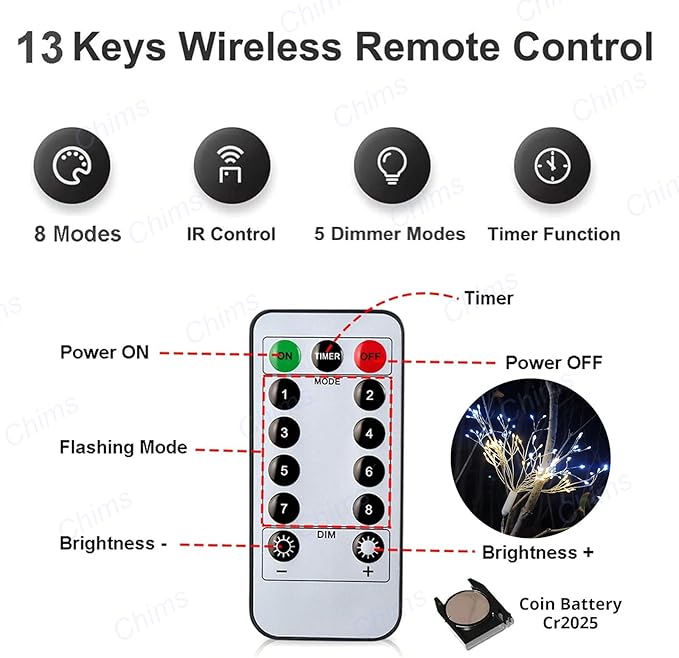 - [8 Lighting Modes & 10 Brightness Adjustable & Timer Setting] The Fairy light is controlled by the remote control. There are 8 lighting flash modes for you to choose. It has 10 brightness adjustment for different atmospheres, and a timer is available to set by remote.
