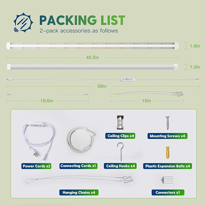 - Easy Installation: Two installation ways—Hanging or Mounting, with included wire rope hooks, clips, connectors, hooks and screws, you could install the plant grow lights indoors by yourself in minutes