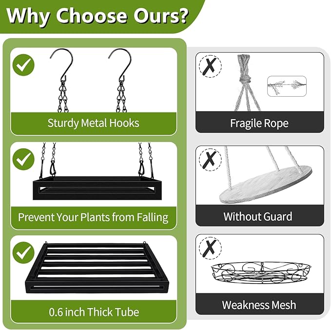 - Metal Construction: The plant hanger itself is very sturdy, a metal frame with 0.6inch thick tube. The welds are tight and the sturdy tube base is having no problem supporting your plants. The heavy duty metal hanging plant holder offers dependable support for your indoor and outdoor plants. Plus, the hanging planters' elegant design adds a touch of charm to any space.