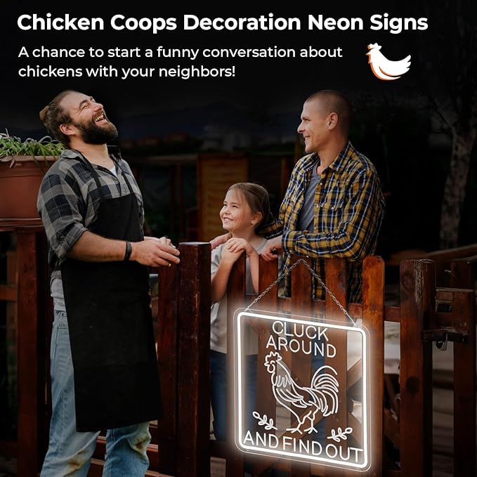 - 【Unique Design Neon Sign for Chicken Coop Decor】Designed with a rounded rectangular frame for safer use.16×16 Inch large sign make it more attractive.Bringing a striking ambiance to any setting, placing it in farmhouse wall,kitchen wall,garden fence,chicken coop.This rooster decor also can provide bright lighting for above occasions!The 3 levels of brightness can be adjusted to ensure that it meets your needs