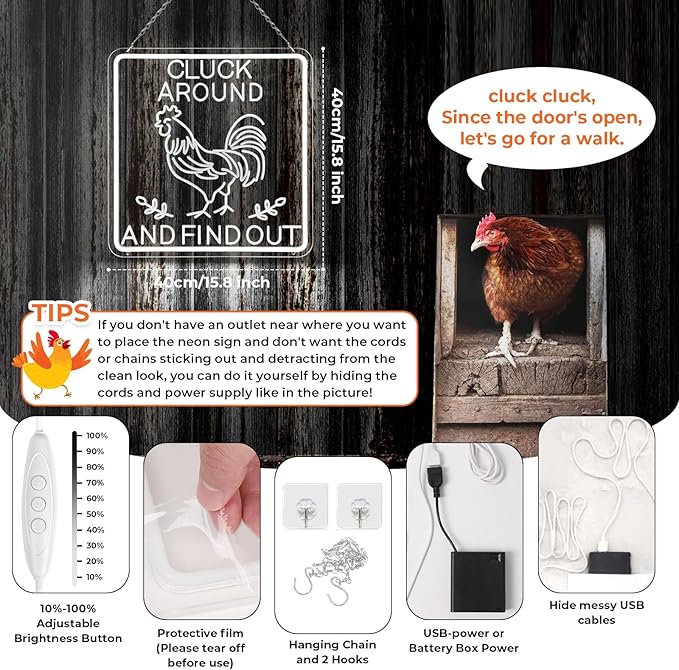 - 【Easy to Install】: Comes With Pre-Drilled Holes. This funny chicken sign comes with everything you need to mount it on your wall, including a high-quality acrylic backboard, metal chain, and hooks. Tip: Please tear off the white film used to protect the product from cuts and scrapes before use, so that the light emitted is more beautiful. It's a hassle-free way to add a touch of humor to your chicken house
