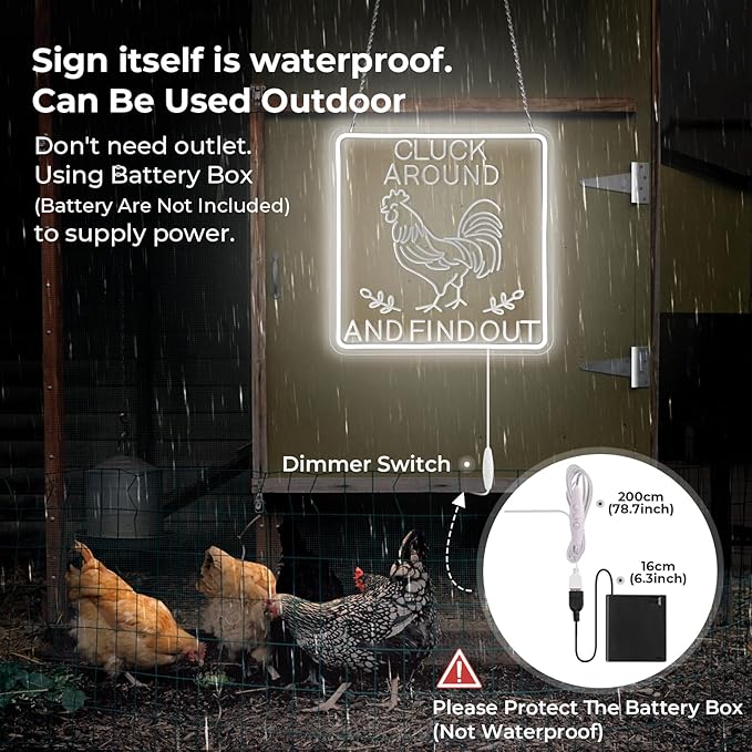 - 【Tip for Use This Rooster Lamp】USB powered or battery pack powered. The lighted sign itself is waterproof and can be used outdoors to add an extra sense of ambiance to your night. However, the included battery box is not waterproof. If you need to use the battery box for power, please protect it extra well. This chicken sign is a great conversation starter and perfect for adding personality to kitchen wall or chicken house,chicken coop.