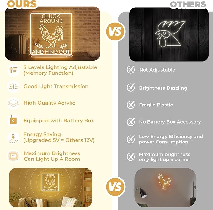 - 【Unique Design Neon Sign for Chicken Coop Decor】Designed with a rounded rectangular frame for safer use.16×16 Inch large sign make it more attractive.Bringing a striking ambiance to any setting, placing it in farmhouse wall,kitchen wall,garden fence,chicken coop.This rooster decor also can provide bright lighting for above occasions!The 3 levels of brightness can be adjusted to ensure that it meets your needs