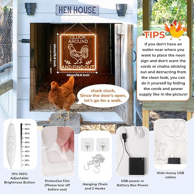 - 【Easy to Install】: Comes With Pre-Drilled Holes. This funny chicken sign comes with everything you need to mount it on your wall, including a high-quality acrylic backboard, metal chain, and hooks. Tip: Please tear off the white film used to protect the product from cuts and scrapes before use, so that the light emitted is more beautiful. It's a hassle-free way to add a touch of humor to your chicken house