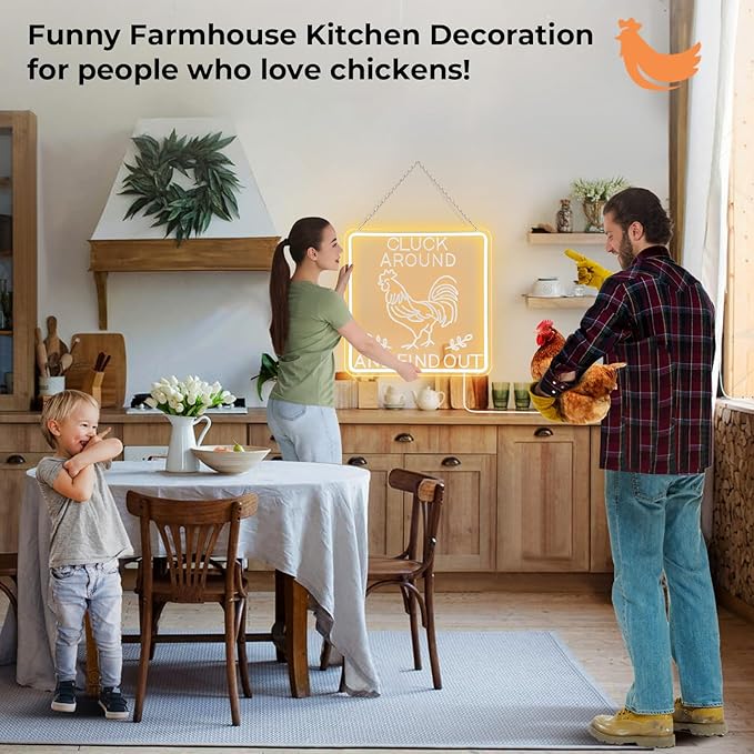 Funny Cluck Around and Find Out Large Neon Sign Dimmable, Rooster Decor 16 X 16 Inch Kitchen Decor for Farmhouse, Chicken Coop, Garden, Farm House Decoration, Rooster Gifts