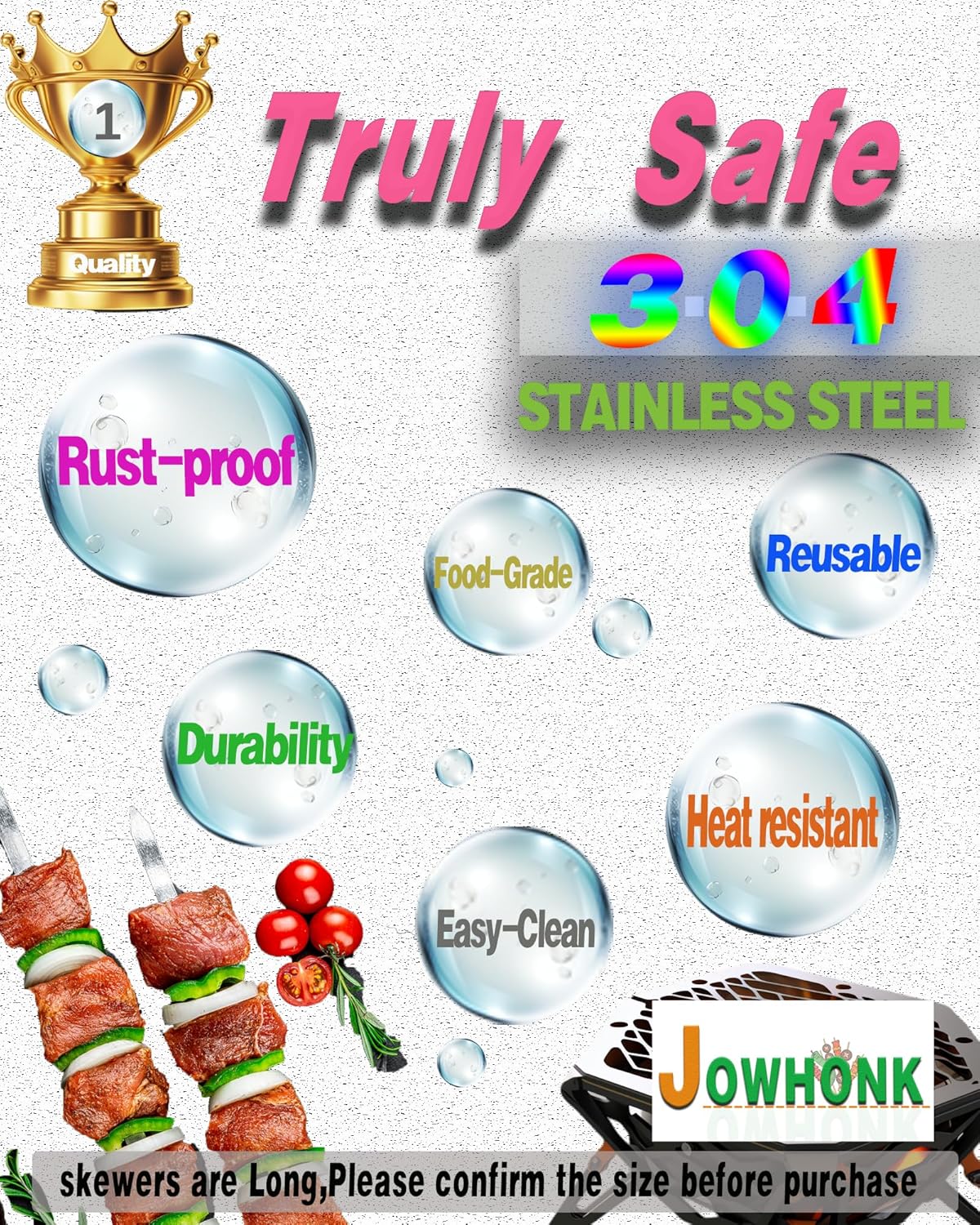 - 【FOOD GRADE 304 STAINLESS STEEL】JOWHONK BBQ 304 stainless steel skewers for grilling are 23.5 inches long,0.4 in width,0.07 in thickness. Our wooden handle flat metal skewers for kabobs are made of premium 304 stainless steel, Ensuring non-rust long time durability, Heat resistant and non-poisonous,Harder than other stainless steel and iron.It's safety for children.Our Premium Stainless steel Barbecue skewers are reusable. The BBQ kabob skewers surface is smooth that grilled food residue won't get stuck onto the kabob skewer blade.