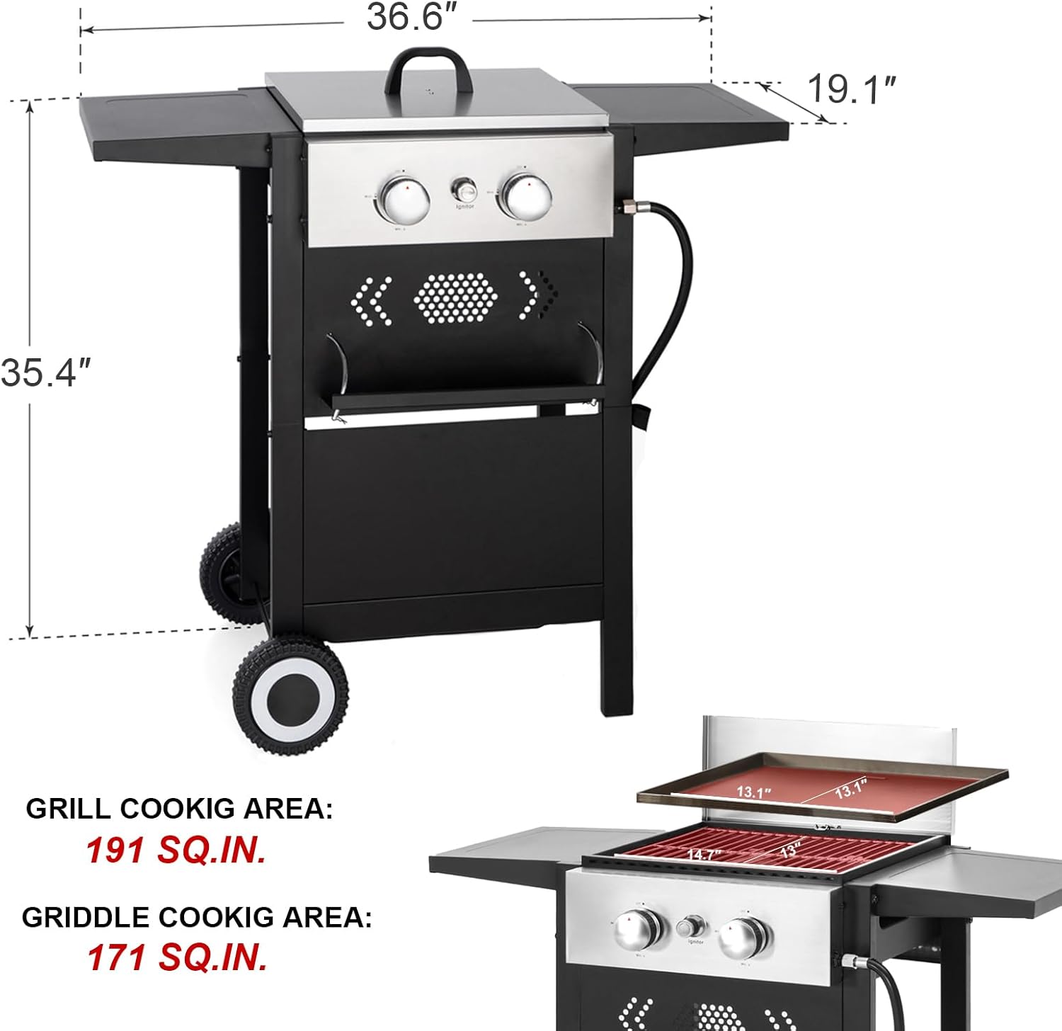 - GRIDDLE GRILL COMBO: Griddle or grill, that won't be a problem anymore! This 2-burner gas grill features 191 square inches of grilling area and 171 square inches of griddle plate space. With its cast iron griddle plate and chrome-plated grates, it offers ample cooking space for a variety of dishes, from pancakes to teppanyaki-style foods. Ideal for outdoor camping, tailgating, picnics, and barbecues