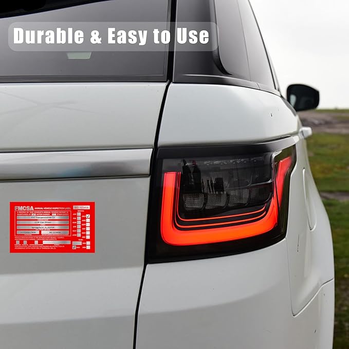 - Label Durability: These red FMCSA vehicle inspection labels are made of 1.6 mil aluminum with a permanent adhesive backing. The indentation from the writing maintains ensures that the label is readable in harsh environments and prevents fading from sunlight or washing.Each vehicle inspection sticker measures 6"x3.5" and displays a three-year date range, including the current year and the subsequent two years, helping to keep track of the next inspection