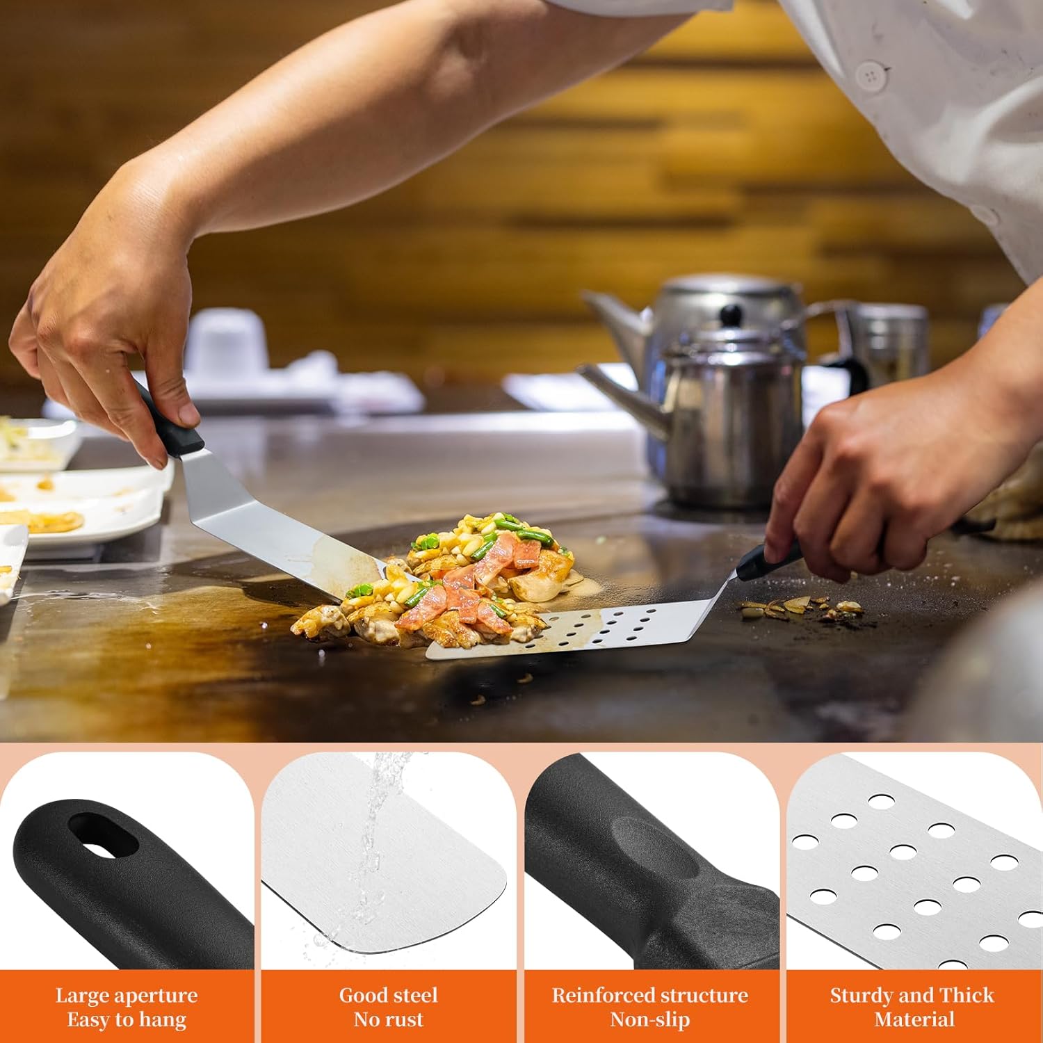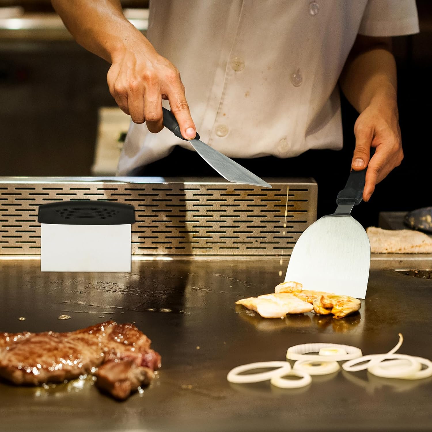 - 【Ergonomic & Heat-Resistant Handles】Our flat-top griddle accessory set boasts ergonomic handles for adult comfort. Extended & heat-resistant, they secure your grip & block heat transfer for safe high-temp cooking. Dry after cleaning to prolong life.