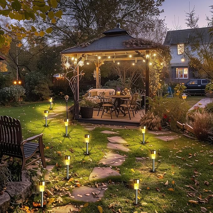 - [SOLAR LIGHTS & ECO-FRIENDLY]:100% solar powered. 20 outdoor solar lights with high-efficiency solar panels can absorb solar energy during the day, turn on automatically at night, and turn off at dawn, which can provide you with free lighting all night