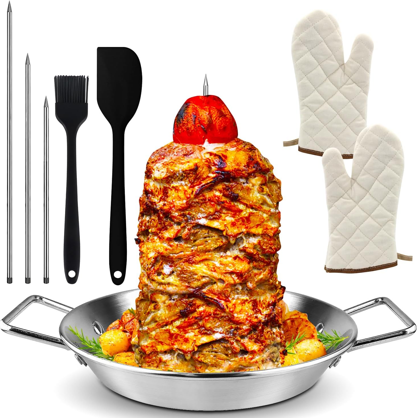 Al Pastor Skewer for Grill -Vertical Barbecue Stand Al Pastor, Kebabs, Shawarma, Gyros, with 10.5 inch base plate and 3 detachable sharp barbecue accessories (8”/10"/12”)& Brushes,Barbecue gloves