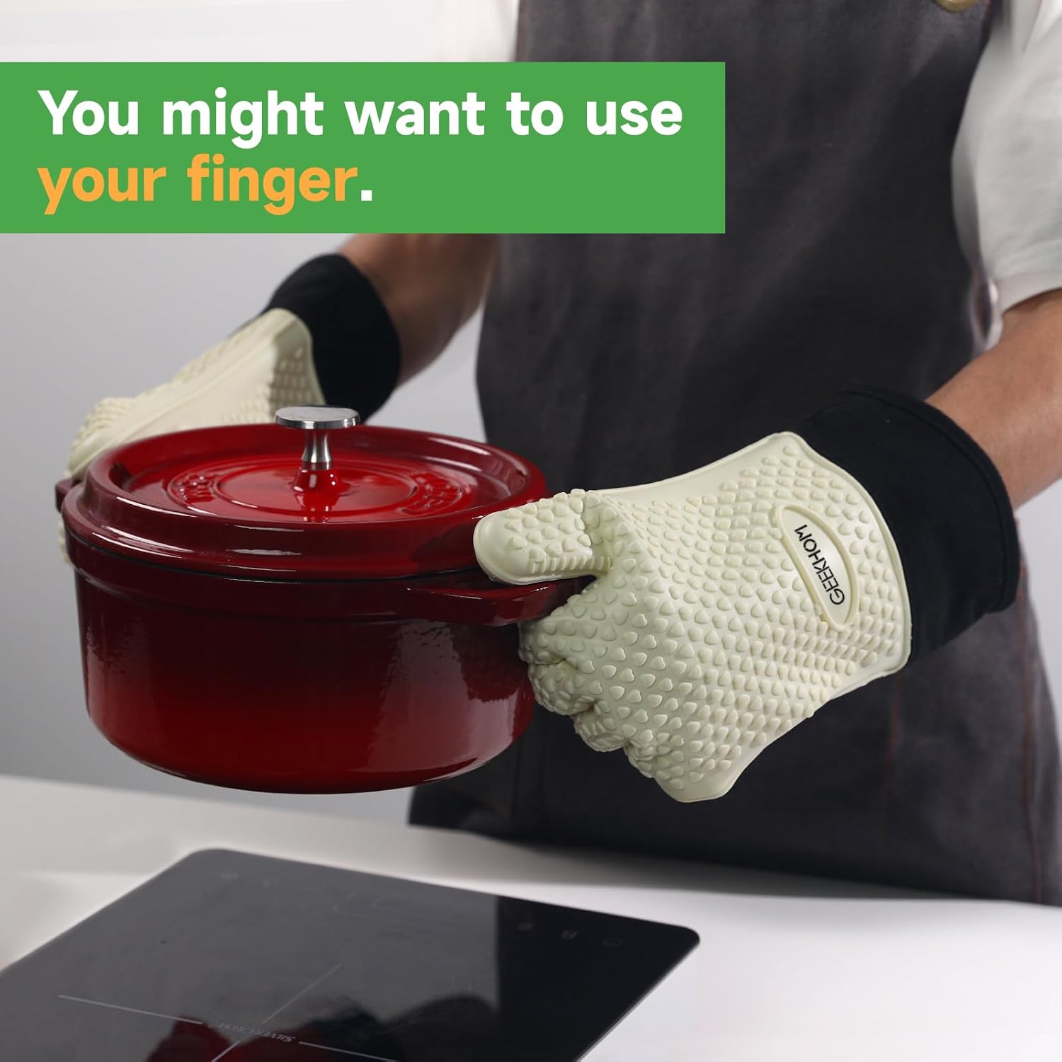 GEEKHOM BBQ Gloves Heat Resistant Oven Mitts - Silicone Grilling Gloves with 14" Long Arm Protection - Waterproof Pot Holder Non-Slip for Men & Women, Kitchen Cooking, Baking, Camping, Beige