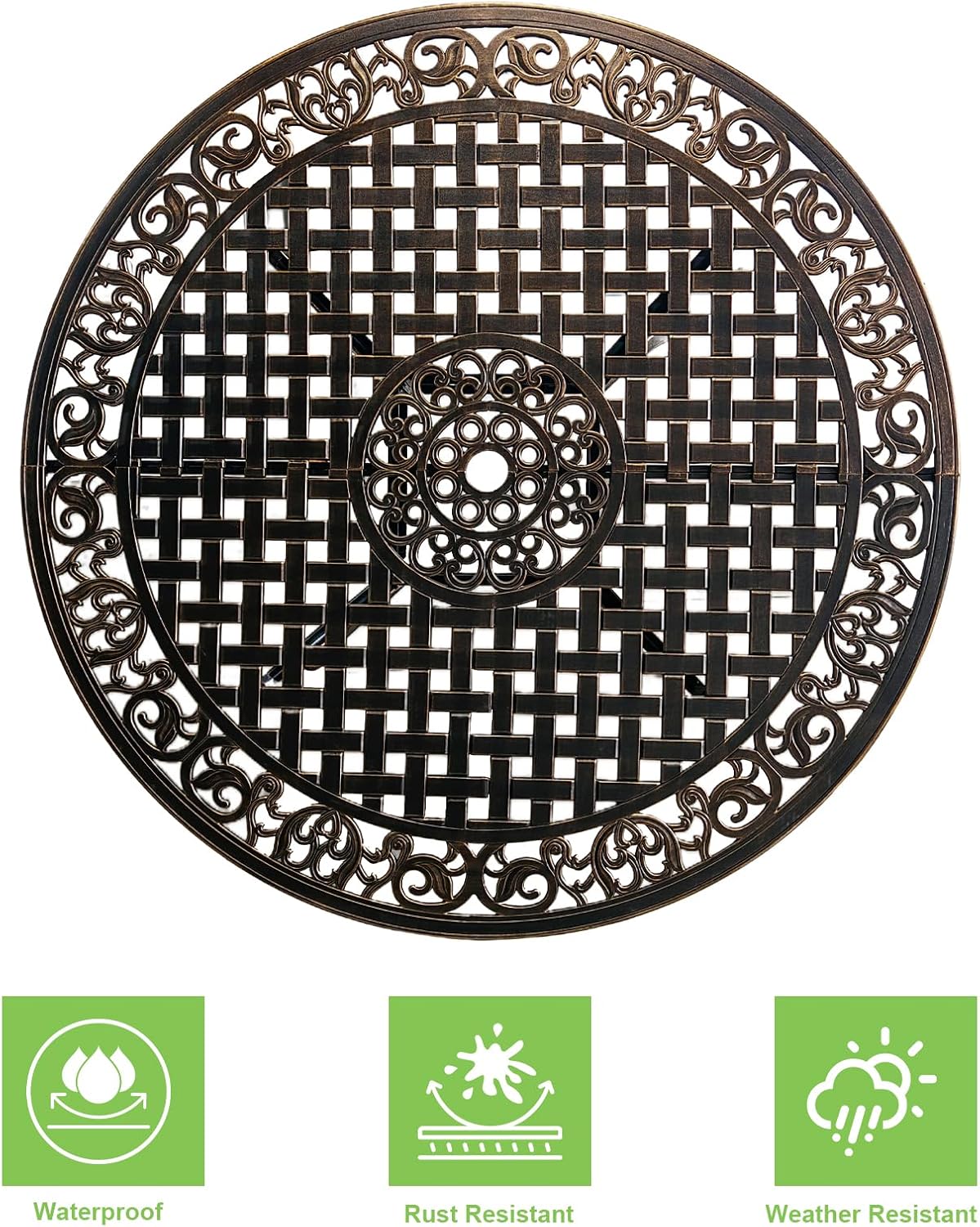 - Widly Occassion: This cast aluminum patio dinning set is with fashional woven design, which come with any stylish patio. Outdoor table and chairs takes you on a relaxing holiday in deck, yard, balcony, garden, lawn, front porch, pool.