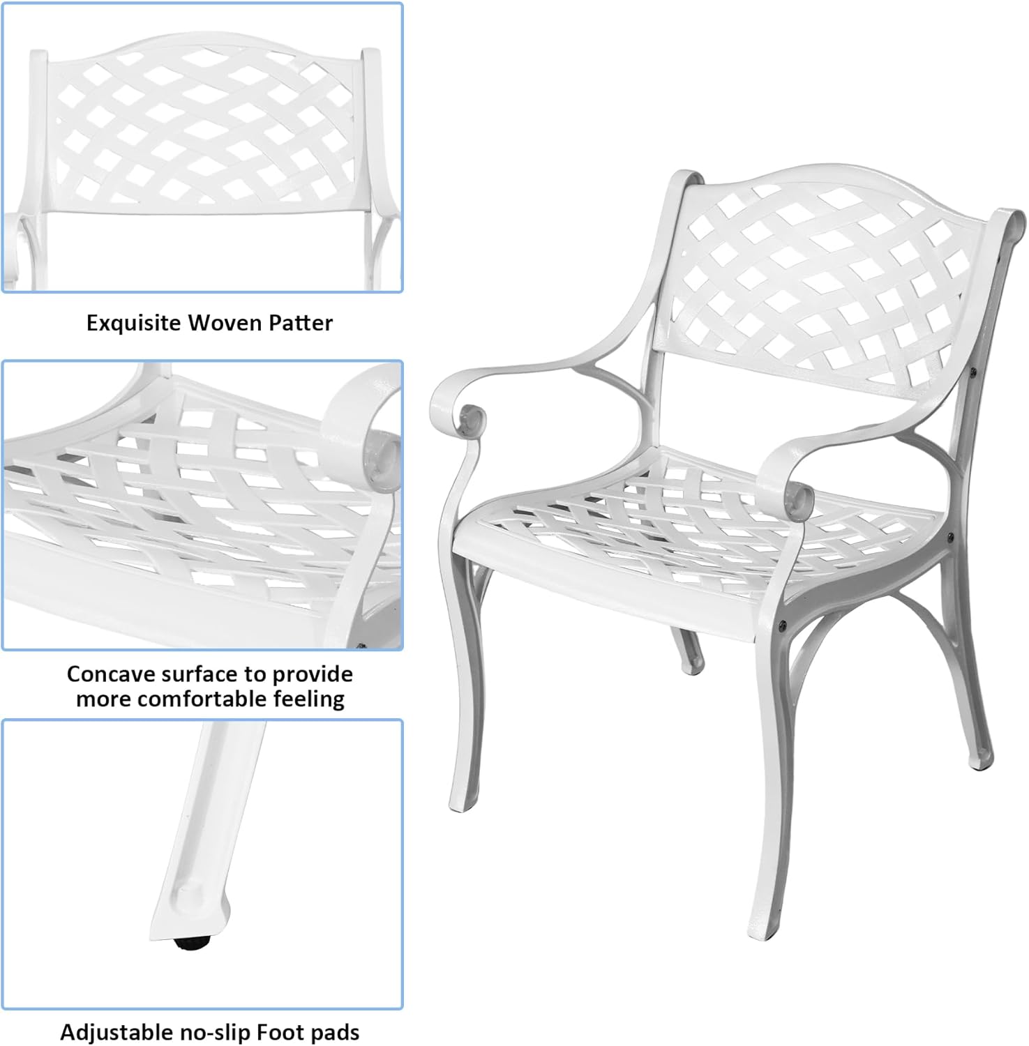 - Widly Occassion: This cast aluminum patio dinning set is with fashional woven design, which come with any stylish patio. Outdoor table and chairs takes you on a relaxing holiday in deck, yard, balcony, garden, lawn, front porch, pool.