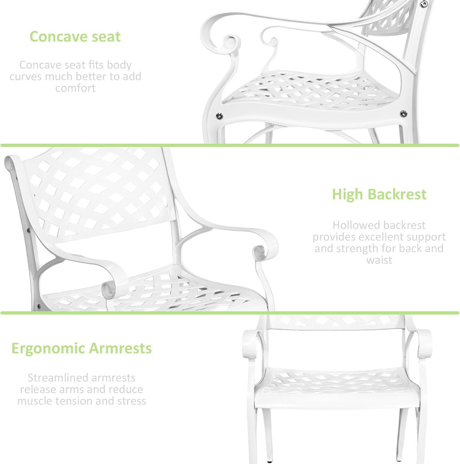 - Comfort Backrest & Ergonomic Armrest: Ergonomically designed backrest and seat of the outdoor bistro sets add more comfort to your body and can effectively relieve fatigue. The curved armrests on patio seating are of moderate height, provide support for hands when resting.