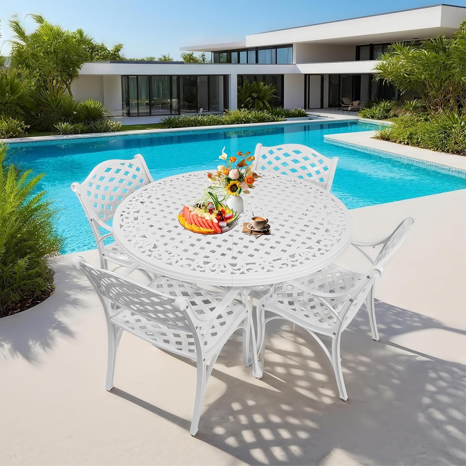 - Size : 48" Round Table, White patio dining set