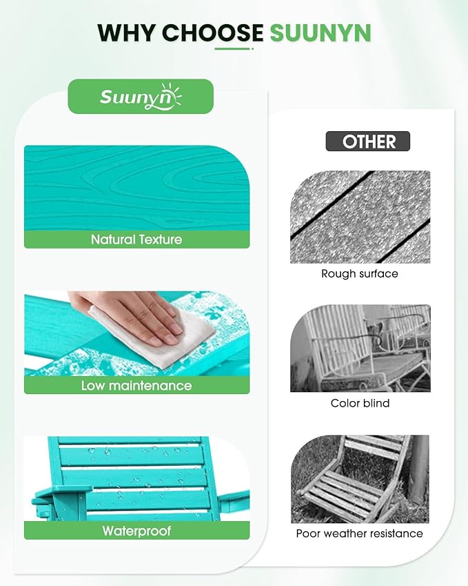 - Weather-Resistant: Made of high-quality HDPE material with wooden texture, SUUNYN sturdy adirondack chair offers excellent weather resistance, resisting fading, splitting, cracking, chipping, peeling, and rotting in harsh conditions. Plus, its easy-to-clean surface and low maintenance