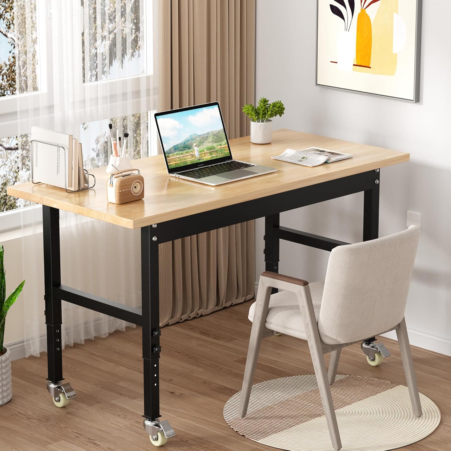 48’’ Work Bench Adjustable Workbench Heavy Duty Work Table with Wheels, 2000 Lbs Capacity Hardwood Work Benches for Garage, Workshop, Office, Home