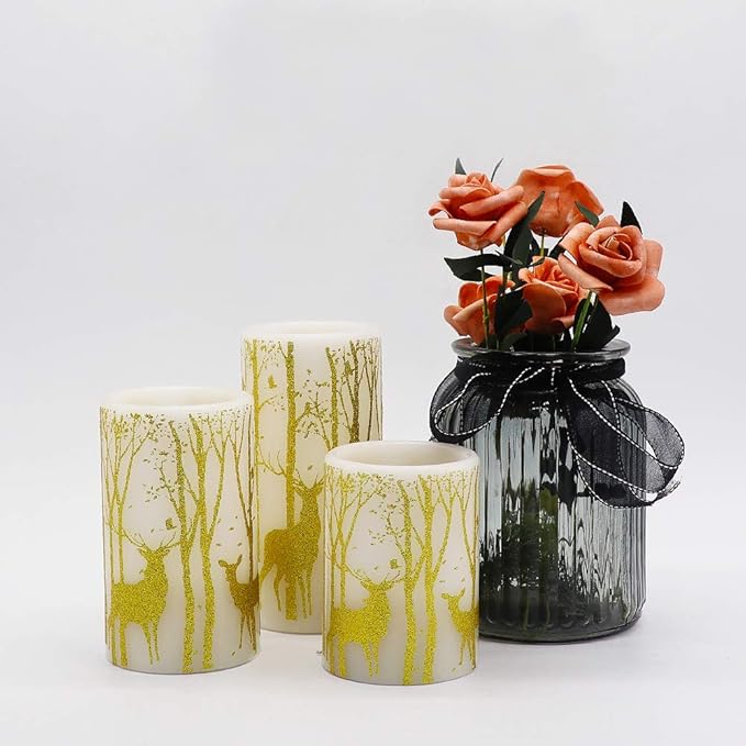 Gold Deer Flameless Candles with 6H Timer, Set of 3 Real Wax LED Flickering Candles, Christmas Pillar Candles with Gold Elk Decor for Home Party Decorations(H6 x D3)