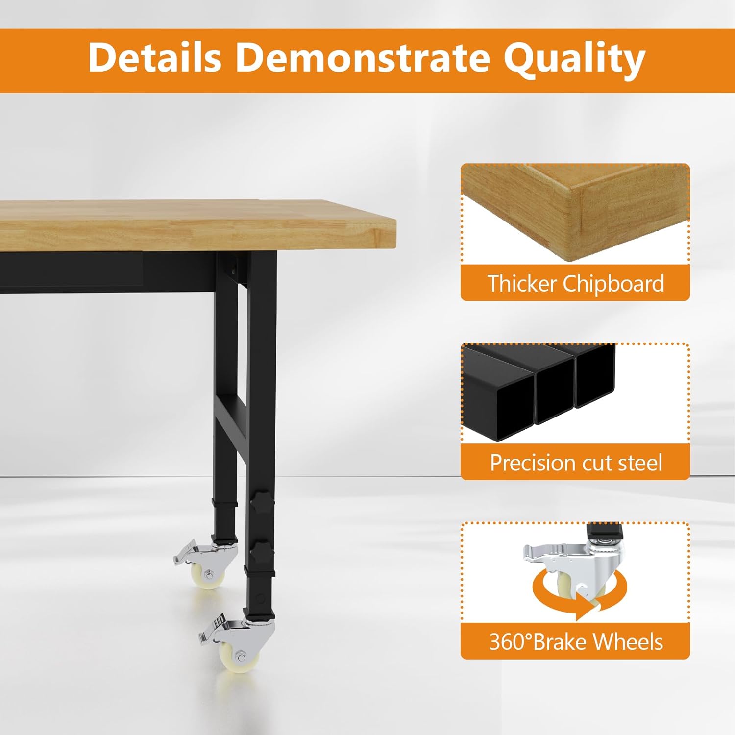 - Smooth-rolling Brake Wheels: Effortlessly move your portable workbench wherever you need it with smooth-rolling brake wheels. Securely lock the wheels in place to provide stability during use, ensuring safety and reliability. Maneuverability meets stability for versatile use in garage projects, workshop tasks, home repairs, or office projects.