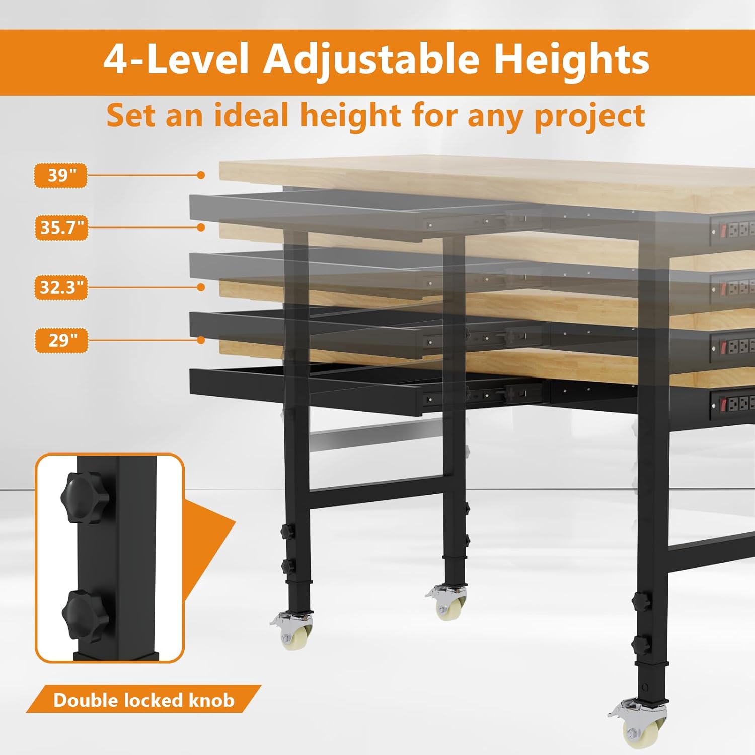- Adjustable Height: This adjustable workbench features an easily adjustable height mechanism, allowing you to set the table height between 29" and 39". This flexibility ensures ergonomic comfort, whether you’re sitting or standing, and can be quickly adapted for different users and tasks, enhancing overall productivity and reducing strain during extended work periods.
