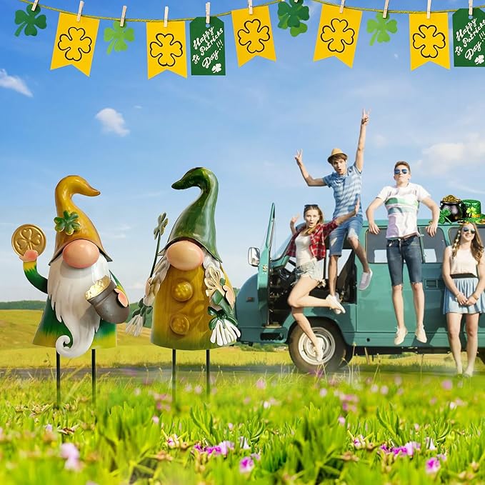 - Lucky Metal Yard Art: The green gnomes wear hats adorned with lucky shamrock. The boy gnome holds a golden coin and gold coin jar, narrating a golden legend of wealth, prosperity, and luck. The girl green elf holding shamrock and gift box, warmly invites you to join this enchanting St Patrick's Day wonderland.
