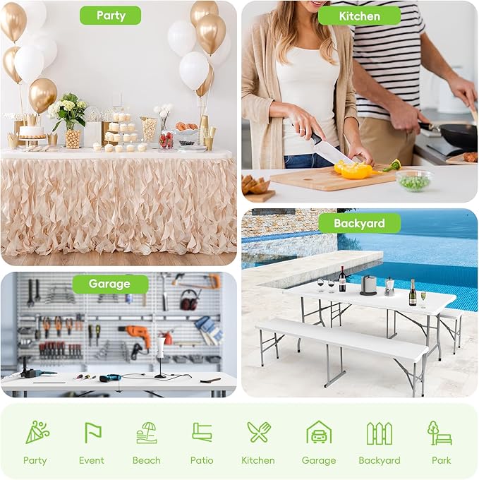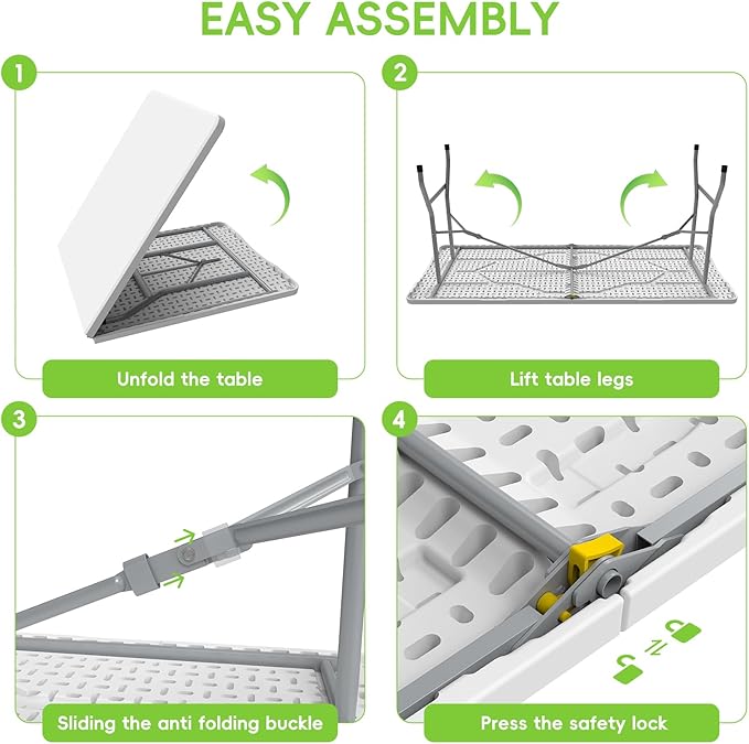 - Quality & Materials: This folding table 6 ft is made with high quality HDPE waterproof material, it has better durability and stability, the table legs are made of thickened steel pipes, can hold up to 300 pounds