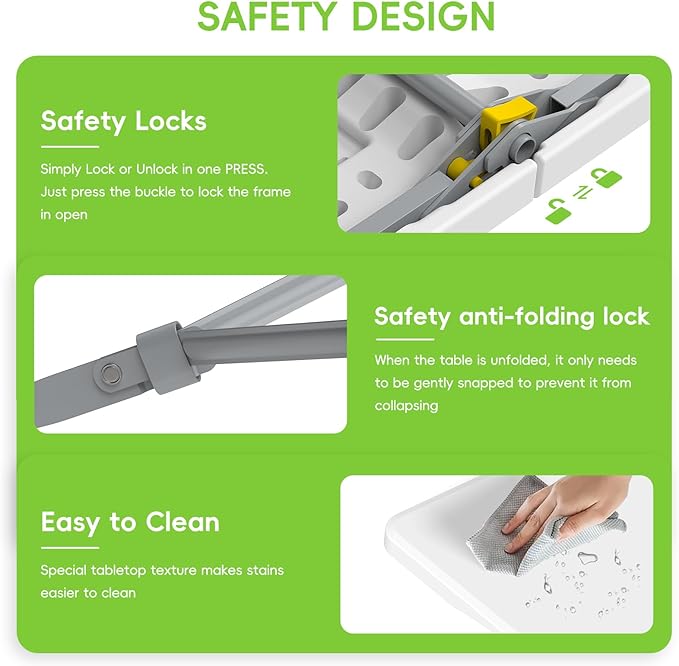 - Safe & Sturdy: This foldable table has two safety designed, one is safely anti-folding lock at the triangular bracket of the table leg, which can hold the table leg; The other is a safety lock on the back of the table top fold that secures the desktop
