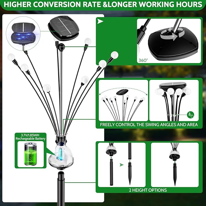 - Unique design: Our solar garden lights have 9 larger and brighter LED premium firefly bulbs, besides the 9 firefly bulbs, there is an illuminating LED light at the bottom which is composed with 6 LED bulbs with warm white lighting to illuminate the pathway. The solar panel is on the top of the lights, which can be rotated in 360° and adjustable to aim at the sky for maximum sunlight absorption.