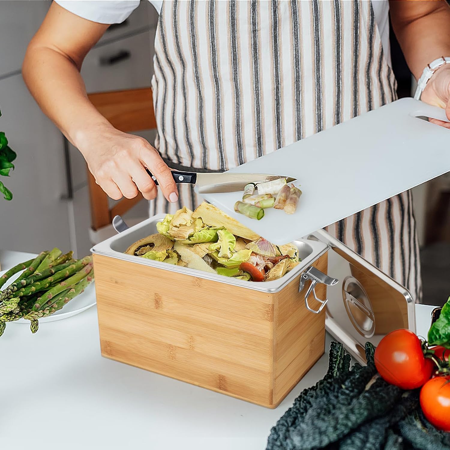 - 【Recessed Design】This kitchen compost bin is easy to clean, when you finish each use, you can directly rinse the built-in stainless steel liner or put it into the dishwasher to clean, and then dry it and then put it into the bamboo wooden box, easy to use