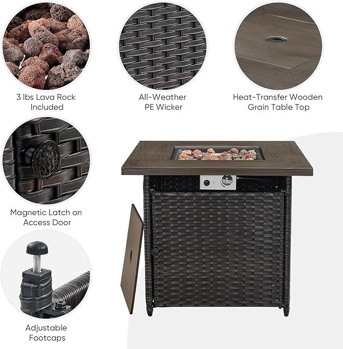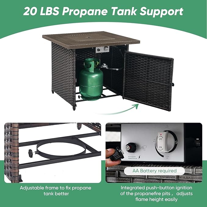- 4.Embrace Warmth and Ambiance: Elevate your outdoor gatherings with the included propane fire table. Perfect for chilly nights, it adds a touch of warmth and ambiance to your space. Make lasting memories as you gather around, enjoying drinks and snacks in style and comfort.