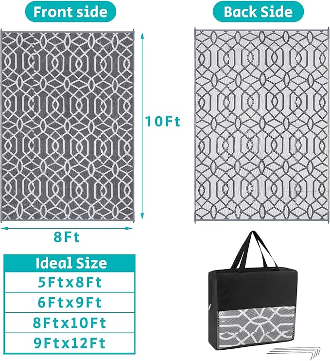 • Versatile Outdoor Carpet: The indoor outdoor plastic rugs have multiple choice in different colors(4'x6',5'x8',6'x9',8'x10',9'x12',9'x18',8'round), is ideal for a variety of indoor outdoor activities,like patio mat, deck rug, garden rug, beach mat, picnic mat, BBQ party mat, rv camping rug,pool rug,outdoor doormat,garage rug,front door mat,allowing you to have plenty of imaginable space for more fun.