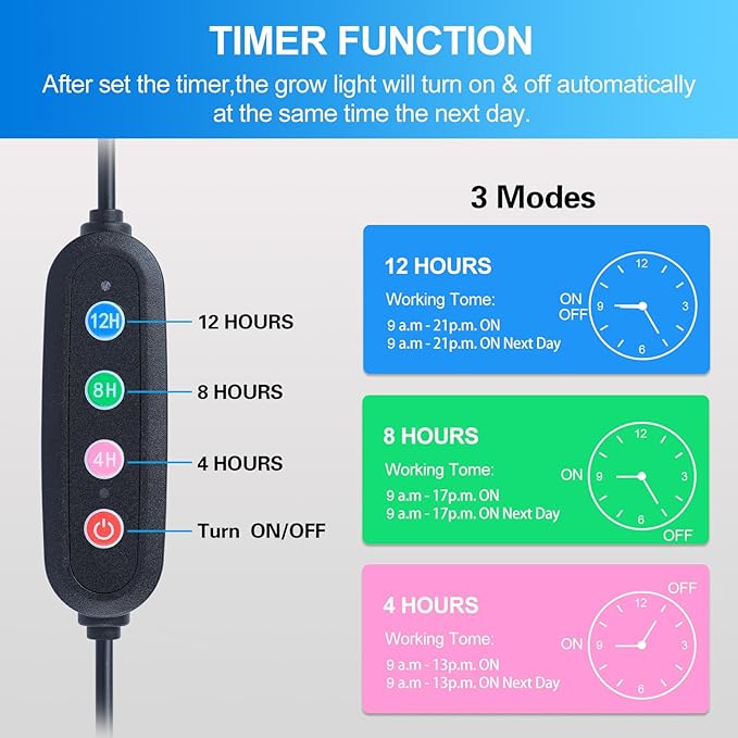 - Timer for Auto On/Off Plant Grow Light---4/8/12H Timer Grow Lights for Indoor Plants. Auto On/Off Every Day Just as You Need.