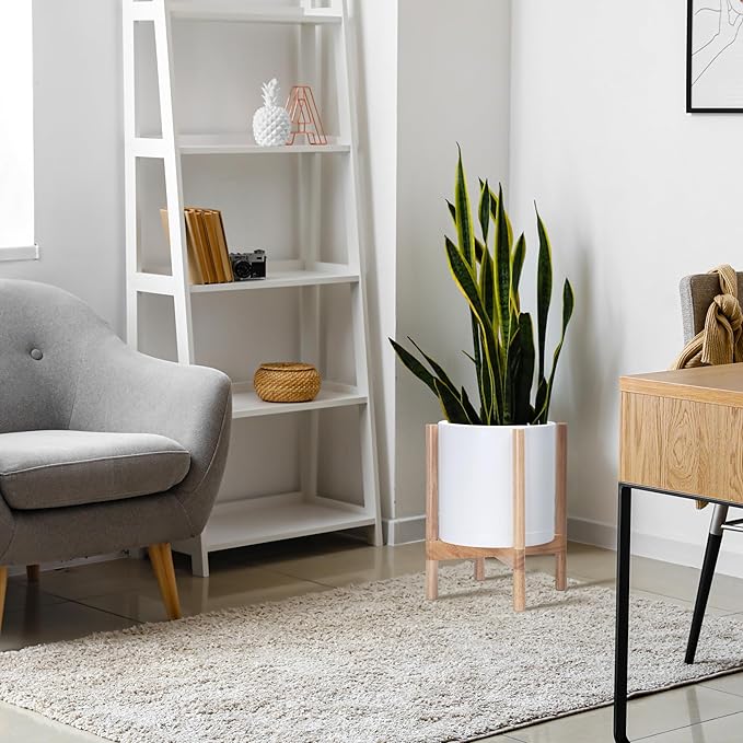 - A Complete Set: Minimalist plastic planter, combined with a sculptural, solid wood stand that match perfectly together and looks great in any home.
