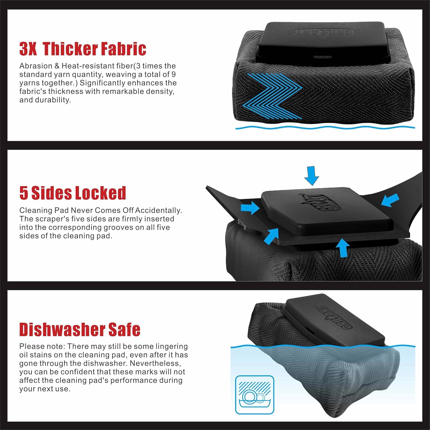 - Sturdy - Strong and flexible stainless steel handle never bends or break, keeping you away from heat sources. Built-in scraper to remove cold buildup. Brush cleaning head is made of heat-resistant StelFyber and is reusable for safe use on hot grills (preheat grill to over 400 degrees Fahrenheit and then turn off all burners for your safety.
