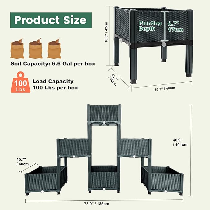- Easy Assembly: Modular designed in 6 boxes. Each needs 5 mins to set up. Raised planter boxes will reduce bending, good to your back and keep plants from wild animals.