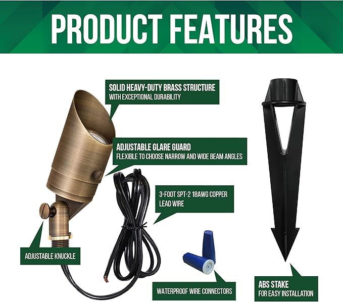 - Easy Installation:Equipped with ABS ground spike, wire connectors (1 #14 w/1-3 #18 or 20, 2 #14 w/1 #18), 39.9’’ pre-wired leads, these lights can be easily installed. Compatible with most 12V landscape lighting systems. Must be powered by a 12V low voltage transformer (not included). MR16 Bulb not included.
