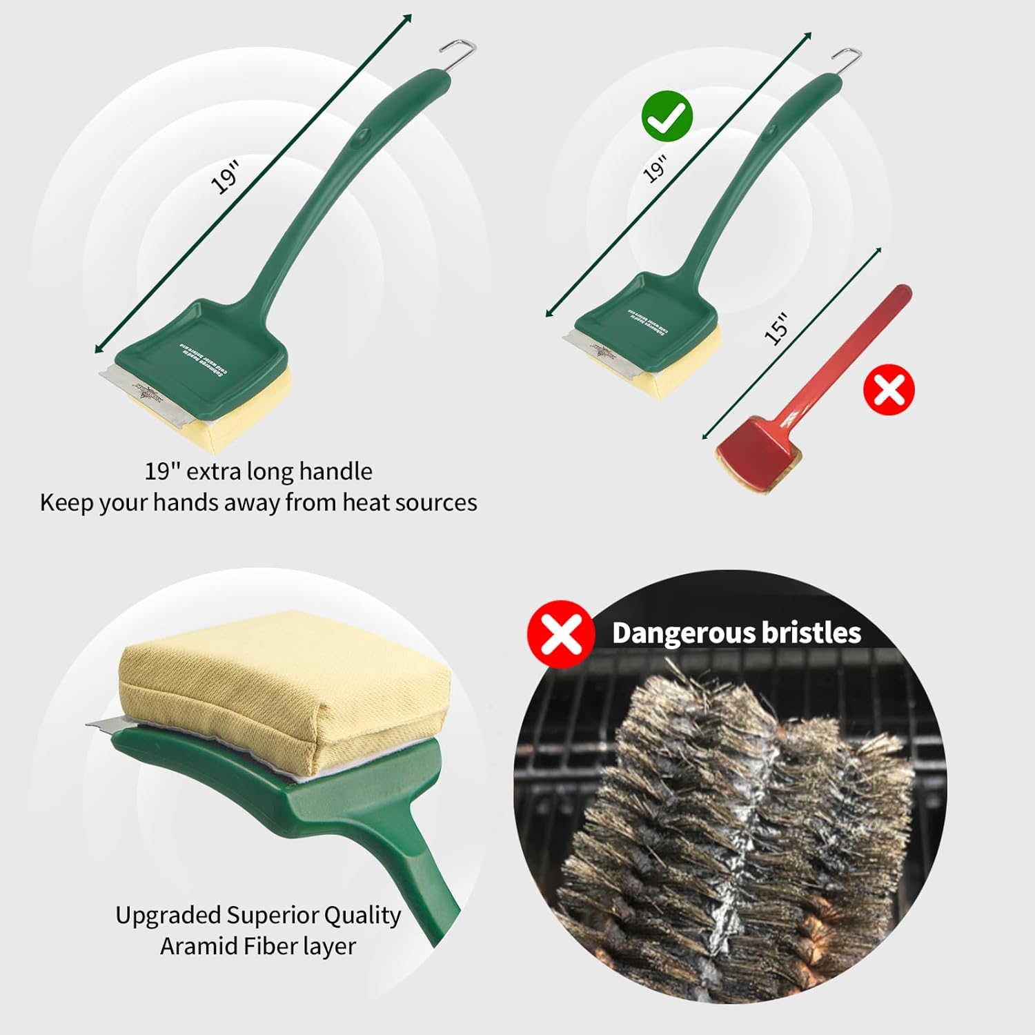 - 【Keep your hands away from heat sources】Not only have we’ve tested this safe bbq brush on numerous gas, charcoal, pellet, and flat-top grills; The 19" reinforced handle never bends or breaks,keep your hand and arm hair away from the intense heat. It truly is the world's safest grill brush