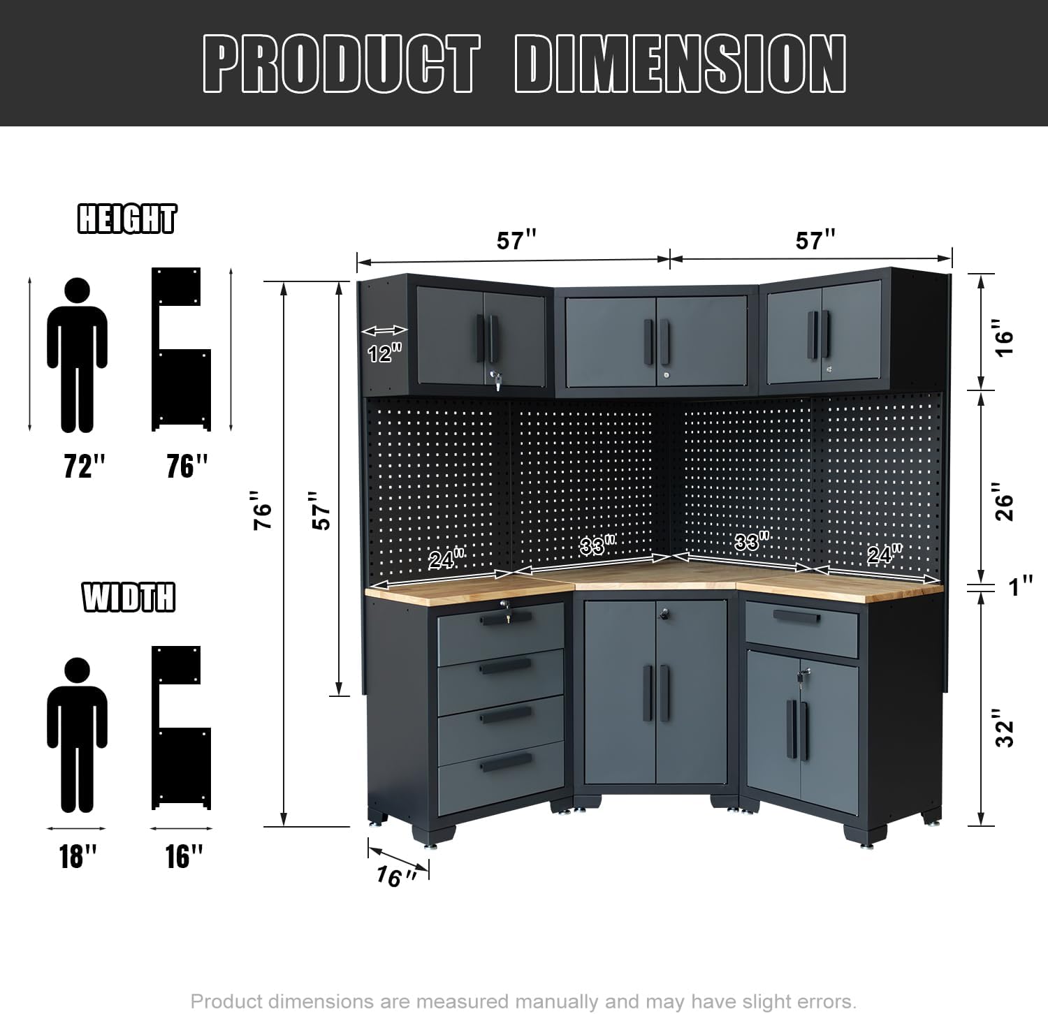 - Corner wall cabinet x 1, corner base cabinet x 1, wall cabinet x 2; 1-drawer cabinet x 2; 4-drawer cabinet x 1; workbench x 3, pegboard x 4