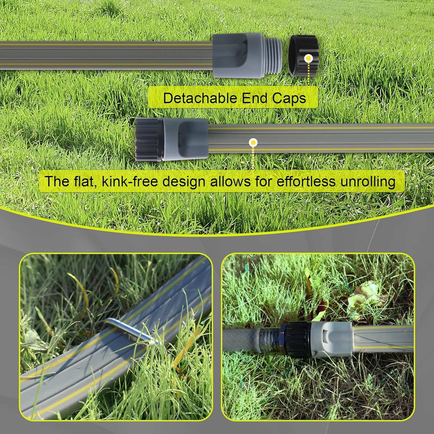 - Efficient Water Distribution with Advanced Three-Tube Design: Featuring a unique three-tube structure and multi-directional holes, this sprinkler hose ensures even and efficient water coverage. With a spray range of 3 to 8 feet and operating at 20-65 PSI, it offers optimal watering for both sprinkler systems and small garden spaces.