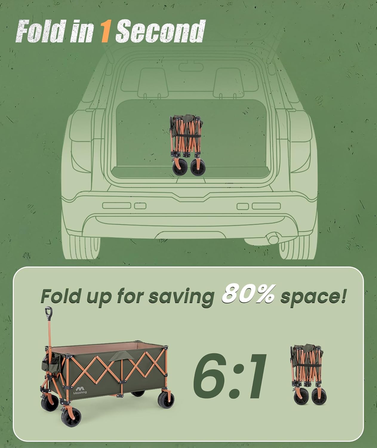 - 𝟲:𝟭 𝐑𝐞𝐭𝐫𝐚𝐜𝐭𝐢𝐨𝐧 𝐑𝐚𝐭𝐢𝐨: We understand the importance of efficiency, which is why our wagon cart offers an excellent retraction ratio. This means that when folded, the lounge wagon takes up minimal space, yet expands to provide ample room for your belongings, making folding wagon carts the perfect balance between portability and functionality