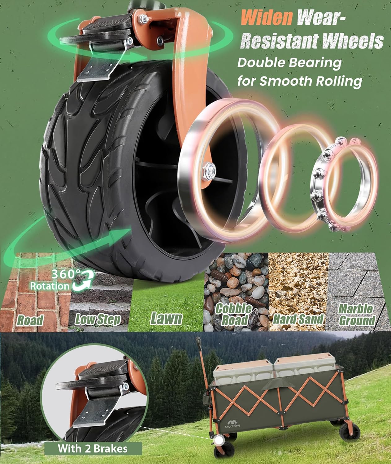 - 𝟳″ 𝐀𝐥𝐥‐𝐓𝐞𝐫𝐫𝐚𝐢𝐧 𝐁𝐢𝐠 𝐖𝐡𝐞𝐞𝐥𝐬: Equipped with 360° big wheels, our utility wagon is designed to handle a variety of terrains with ease. The wheels come with a reliable braking system, providing you with control and safety on uneven or inclined surfaces. Whether you're navigating through your garden, beach, or a construction site, the wheels of our grocery wagons ensure a smooth ride under control