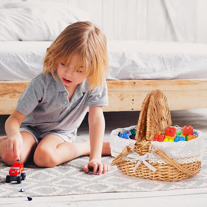 Happypicnic 12" Picnic Basket - Small Wicker Basket with Foldable Handle Lid & Removable Liner | Cute Picnic Basket Toy Empty for Kids, Gift, Halloween, Christmas, Valentines, Easter, Birthday, Flower