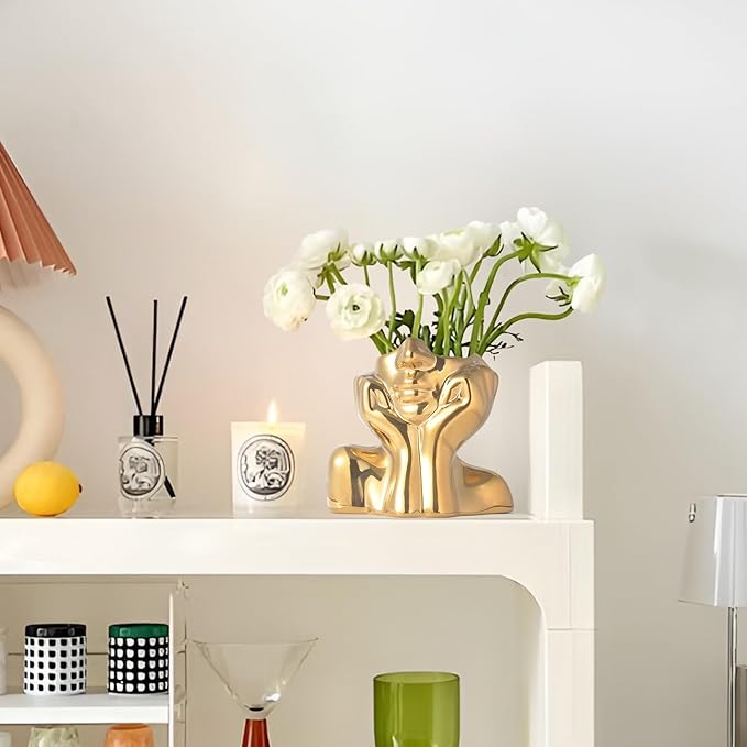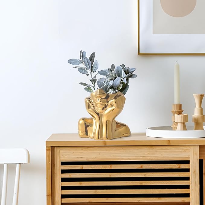 Gold Ceramic Human Face Decorative Vase - Shy Posture Modern Art Desktop Display for Bookshelf, Living Room, Office, Bedroom